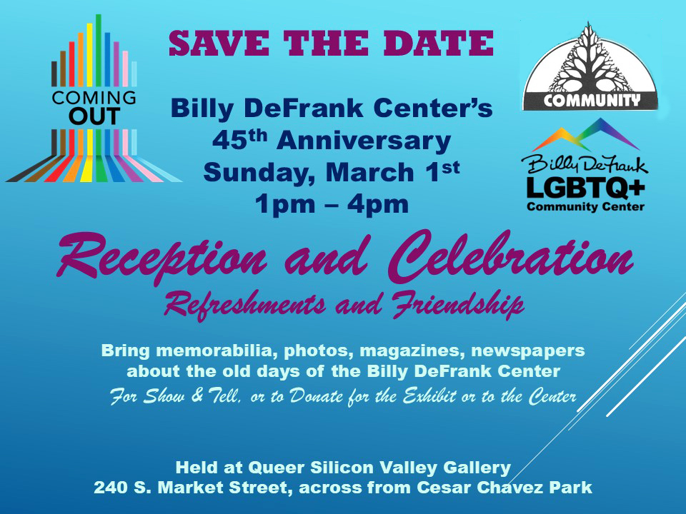Please join us for a Reception & Celebration, Refreshments & Friendship for Billy DeFrank Center’s 45th Anniversary